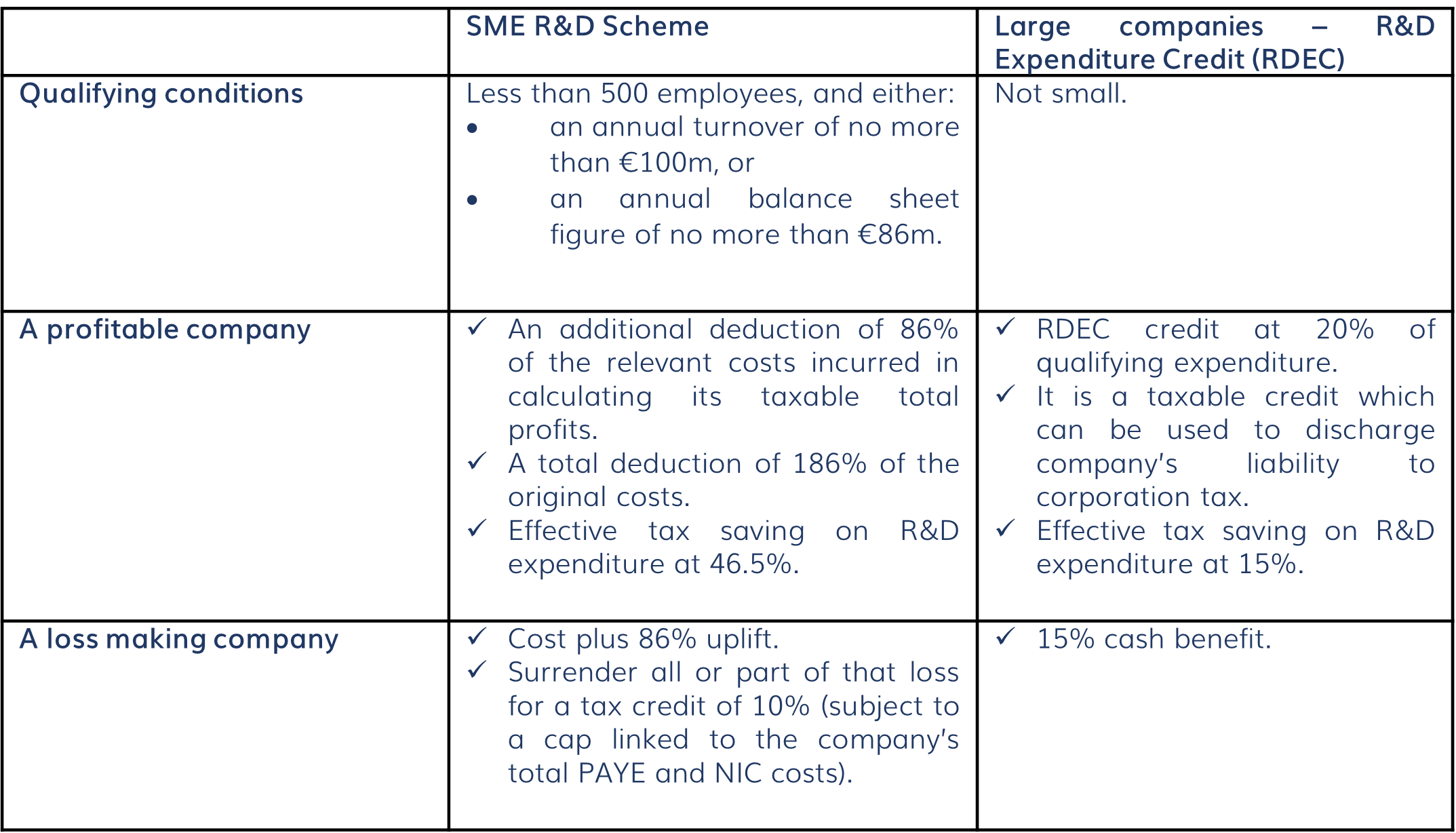 A trading company can tax deduct revenue expenditure against the profits of the trade and capital expenditure may be eligible for a 100% R&D allowance. There are two types of additional R&D reliefs and the type depends on whether the company is a small medium-sized enterprise (SME) or a large company.