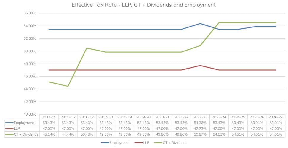 With the Autumn Budget 2025 keeping most headline rates stable for 2026/27 – aside from a 2% increase in dividend ordinary and upper rates from 6 April 2026 (to 10.75% basic and 35.75% higher, with the 39.35% additional rate unchanged) – the long‑standing comparison between LLP and Ltd structures remains highly relevant for UK asset managers.